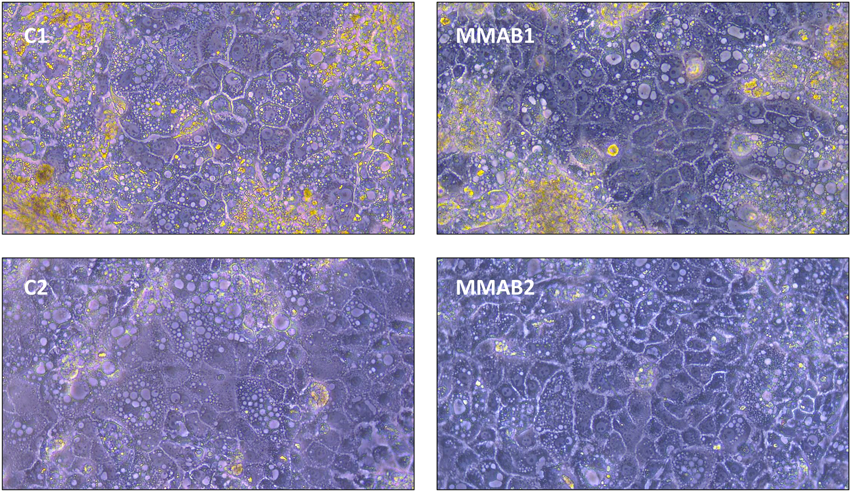 [*] Explicación de la figura: Morfología celular de los hepatocitos después de la diferenciación de iPSC derivadas de fibroblastos de piel de pacientes con aciduria metilmalónica MMAB e iPSC de individuos sanos. Imágenes representativas de microscopía de campo claro del día 22 de diferenciación. Imágenes tomadas con objetivo 20x.