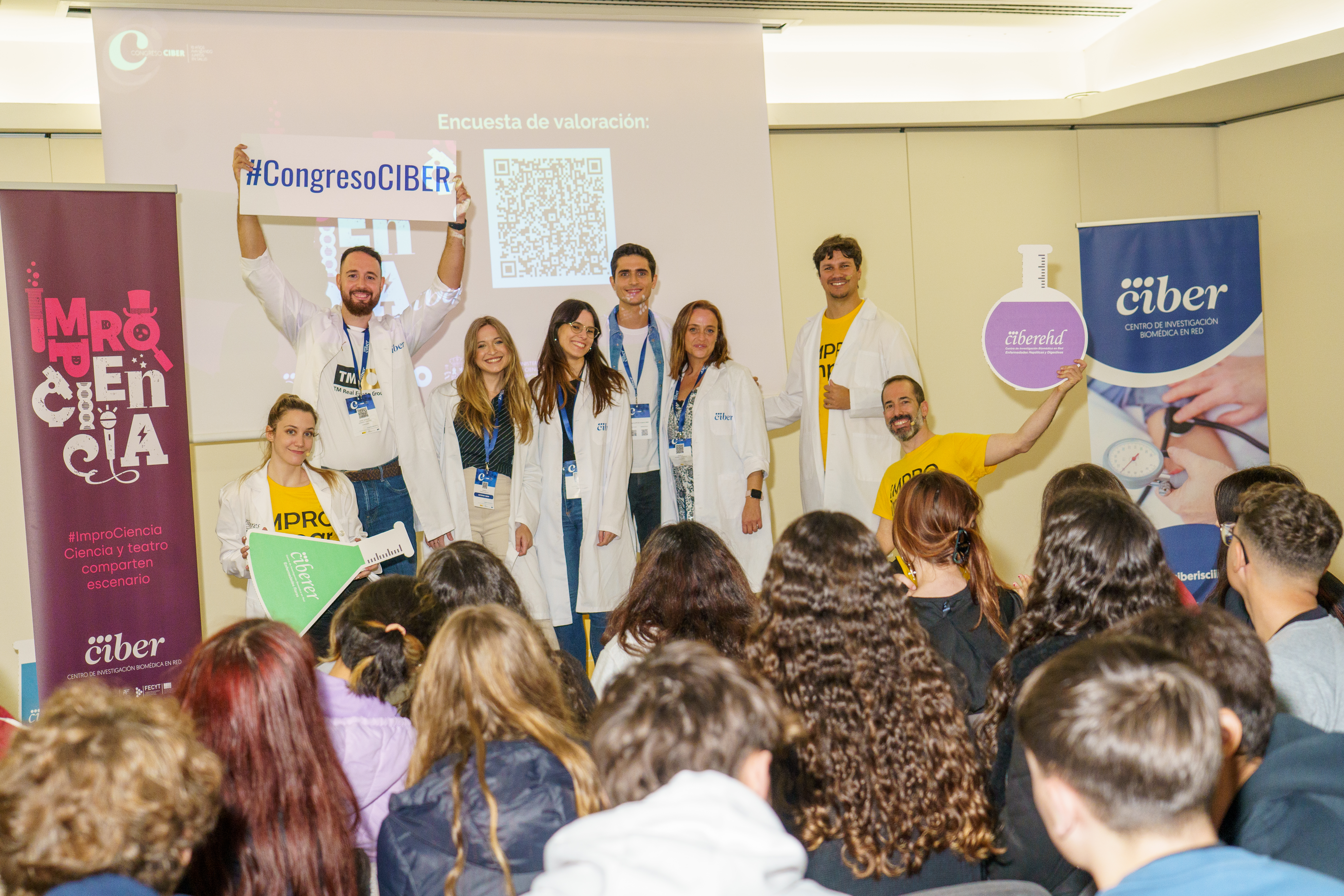 Más de 300 estudiantes de ESO, bachillerato y ciclos formativos de FP en salud llenaron el Palacio de Congresos de Valencia para disfrutar de ImproCiencia, una actividad que combina divulgación científica e improvisación teatral. Organizado por la Unidad de Cultura Científica e Innovación (UCC+I) del CIBER, este evento se celebró el 28 de noviembre como parte del I Congreso CIBER que se realizó para conmemorar el 10.º aniversario del consorcio.