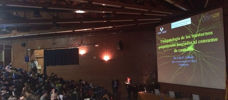 A continuación intervino el Dr. Koldo Callado, Profesor e investigador del grupo G16 del Departamento de Farmacología de la Universidad del País Vasco, quien introdujo a los alumnos en las bases biológicas y moleculares de los mecanismos de acción de los componentes del Cannabis y en las posibles vías fisiopatológicas de neurotransmisión modificadas por el THC y asociadas a la sintomatología psicótica y a los déficits cognitivos descritos en consumidores.