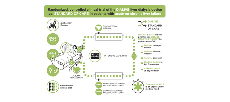 El ensayo internacional, controlado y aleatorizado desarrollado en 18 hospitales europeos se ha realizado en pacientes con cirrosis y hepatitis alcohólica que sufrían insuficiencia hepática aguda sobre crónica. Los pacientes fueron aleatorizados a recibir de tres a cinco sesiones de tratamiento, con una duración de ocho a doce horas por sesión con el dispositivo DIALIVE o a recibir el tratamiento estándar